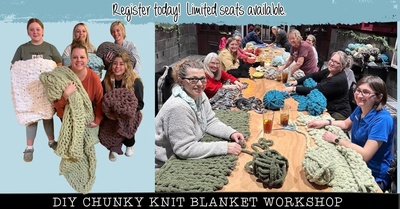 Sip and knit with us! Join us for the fun and cozy chunky blanket workshop. No experience necessary and everyone is welcome. Our instructors will take you step-by-step to create a comfy, cozy and fabulous chunky knit blanket. 12 & up welcome as registered guest, guys welcome too!