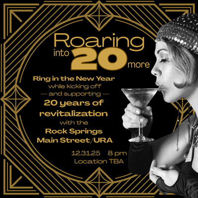 Kick off the Rock Springs Main Street/URA’s 20th year in style at this glamorous Roaring 1920s–themed New Year’s Eve gala! Enjoy heavy hors d’oeuvres, cocktails, live music, dancing, a silent auction, special activities, and a sparkling midnight toast. Dress in 1920s attire or black-tie optional.