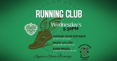 Join Square State Brewing's Running Club on Wednesday's for weekly fitness, fun, and post-run brews. All paces and walkers welcome! Choose your distance: 2K, 5K, or 10K routes on the road.